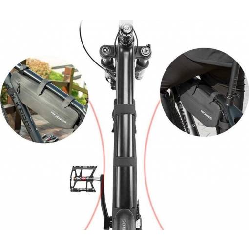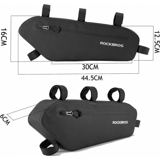 Jednoduchá instalace: Pomocí pěti nastavitelných suchých zipům brašnu připevníte mezi horní a sedlovou trubku kola. Díky šířce pouhých 6 cm Vám při jízdě nebude překážet.