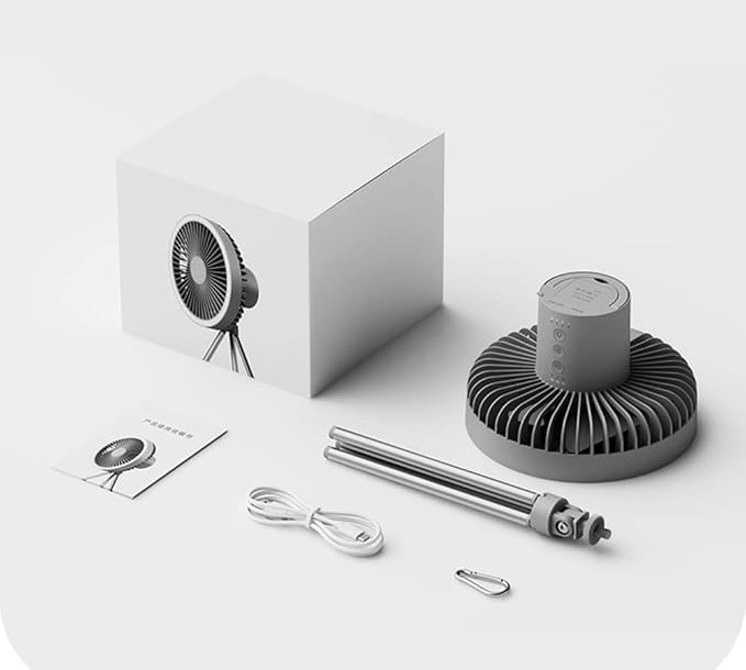 Ventilátor je vybaven jak závěsným uchem (součástí balení je též karabina) tak stojanem se třemi nožičkami, které zajistí stabilitu.