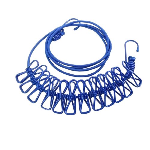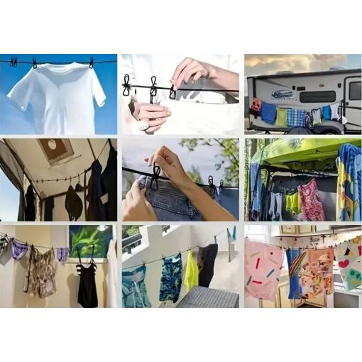 Praktická cestovní šňůra na prádlo s pevnými kovovými kolíčky je ideální pro sušení oblečení doma, na cestách i při kempování. Díky pružnému materiálu a háčkům na koncích ji snadno upevníte mezi stromy, na balkoně nebo v koupelně.
